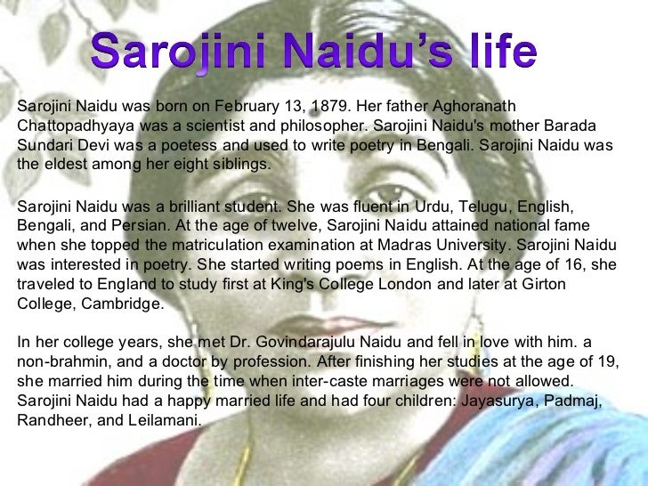 · Sarojini Naidu is a very well-known personality in India as she was a famous poet, a freedom fighter and a social activist in India. She was born on 13th February in Hyderabad and passed her matriculation exams very easily. She got a chance to study in England which she accepted and studied for four years at various colleges in England · Sarojini Naidu was a poet and a freedom fighter of India. She is famously known as ‘Nightingale of India’ because of the beautiful poems that she wrote. Sarojini Naidu was born in a family where her father was in charge of a college in Hyderabad and her mother was also a poet. She had studied at King’s College, London and Girton College, blogger.comted Reading Time: 3 mins · Sarojini Naidu was a great patriot, politician, orator, and administrator. Her personality was extraordinary. She was a social worker, an ideal housewife, and a great poetess. She was the most famous lady of the 20th Century. Her birthday is celebrated as ‘women’s day’ every year. This great lady was born on 13th Feb. in Hyderabad